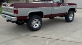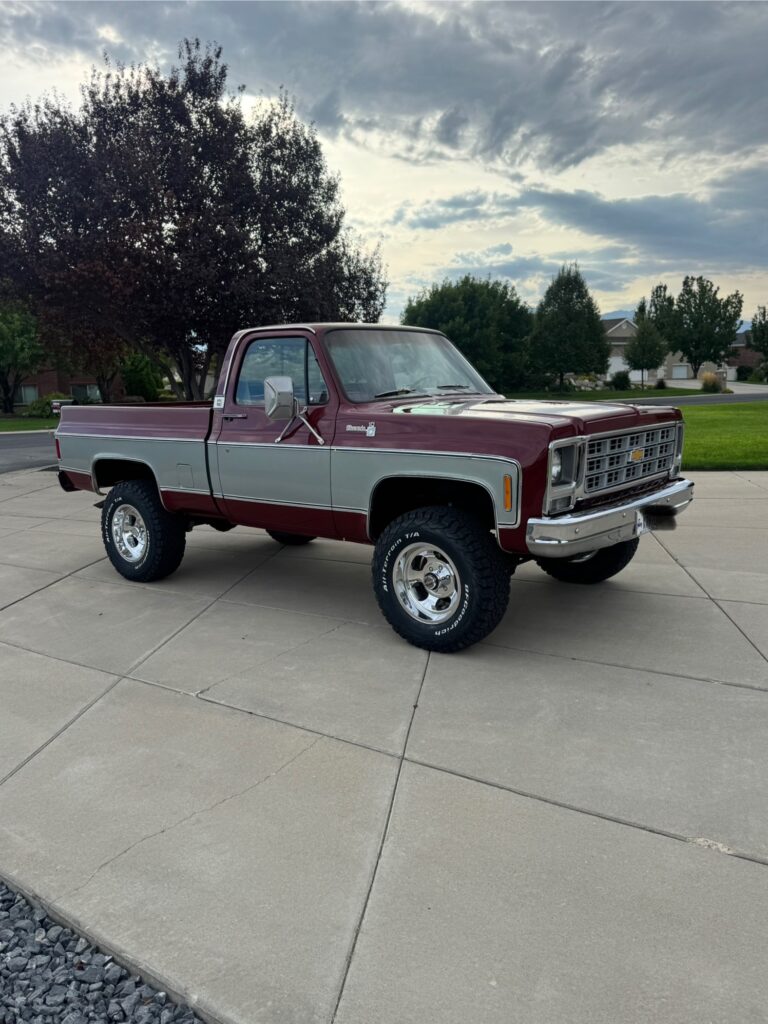 Factory short bed refinished in its original color combo. 78k original miles on the truck, zero rust on the truck any where. Newer 350/ with rebuilt turbo 350. Runs drives and shifts as it should. Very meticulously owned. Bought from owner who had it for 30 plus years. All new interior including custom bolster bench seat, carpet, dash pad, door panels, tilt column etc. everything works on the truck as it should. Cold AC/ working heater. New lift, wheels tires, alignment.